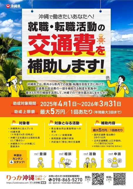 沖縄県への就職を支援するため、県外在住者の沖縄県内での就職活動にかかった交通費・宿泊費の半額(上限5万円)を最大3回補助します。
