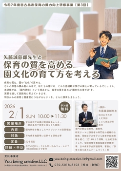 そこで、宮古島市では、質の⾼い保育を提供する担い⼿である職員に対する保育の質の向上を⽬的に、全3回の研修会を以下のとおり実施します。