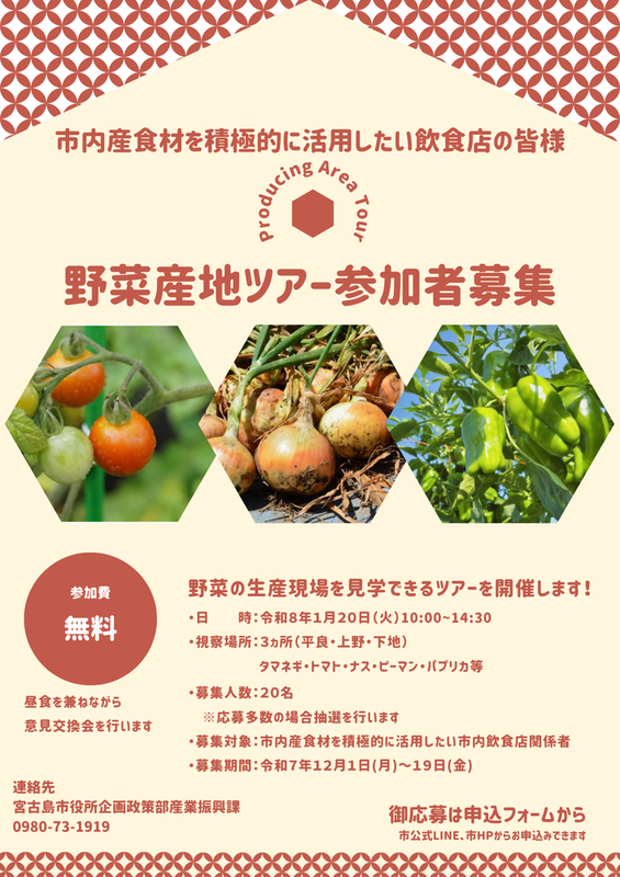 宮古島市産業振興課では、市内飲食店と生産者の情報共有及び宮古島市産食材の活用促進に繋げることを目的として野菜の生産現場を見学できるツアーを開催します。