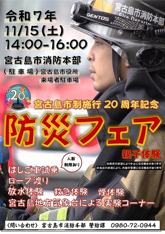 消防車両や使用している各種資器材の展示、体験ブースでは緊急時に役立つ救急体験やはしご車試乗体験、放水体験などのほか、宮古島地方気象台による防災について学べる展示・実験など来場者が楽しめるような内容を予定しています。